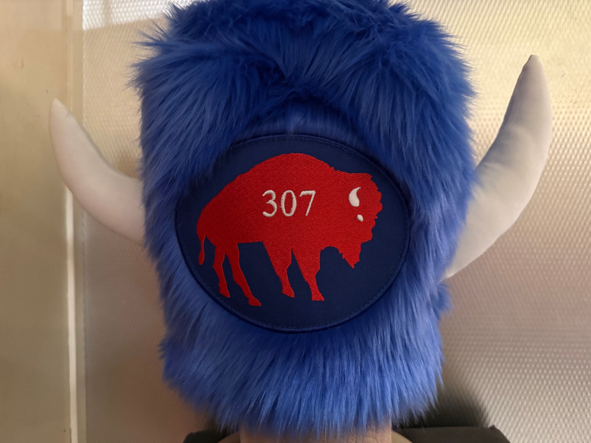 Our Water Buffalo Club logo patch is sewn on the front of the hat. On the back of the hat is a tag that reads 'Water Buffalo Club, made in Buffalo, NY.' They are made from luxury shag fur, one of the most popular furs commonly used in mascot suit-making. It is known for its shiny softness. The inside has sturdy foam to hold them up and is then lined with a cotton jersey knit material, and is very soft on the skin. If they get wet, only hang them to dry; do not put them in the dryer as it could ruin them.