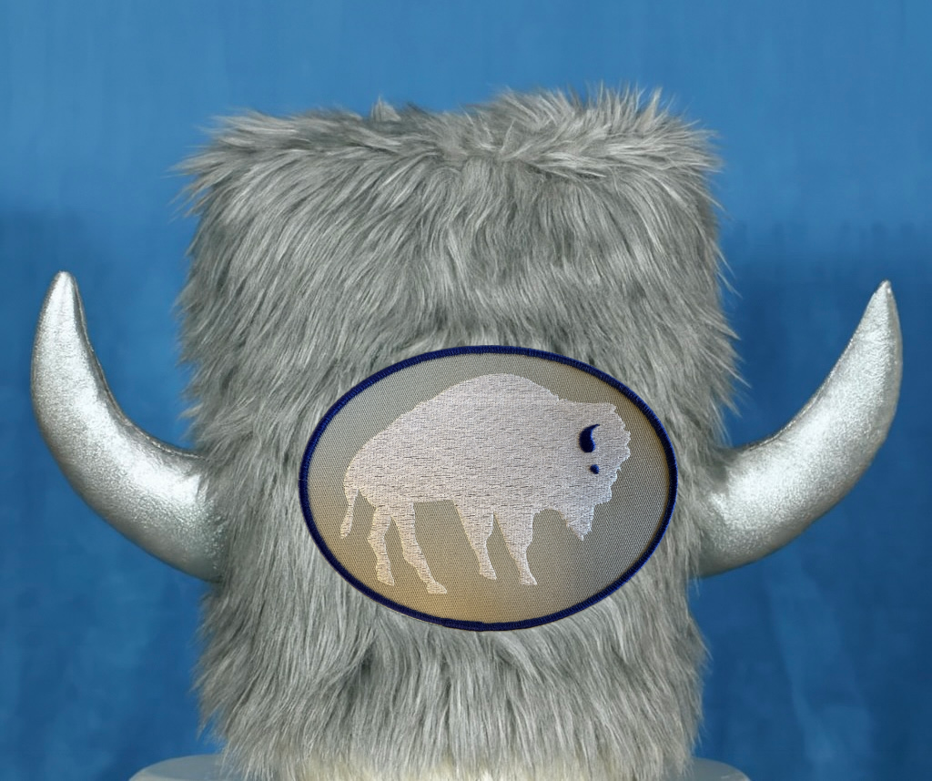 A special edition Water Buffalo Club logo patch is sewn on the front of the hat. On the back of the hat is a tag that reads 'Water Buffalo Club, made in Buffalo, NY.' They are made from luxury shag fur, one of the most popular furs used in mascot suit-making. It is known for its shiny softness. The inside has sturdy foam to hold them up, is lined with a cotton jersey knit material, and is very soft on the skin. If they get wet, only hang them to dry; do not put them in the dryer as it could ruin them.