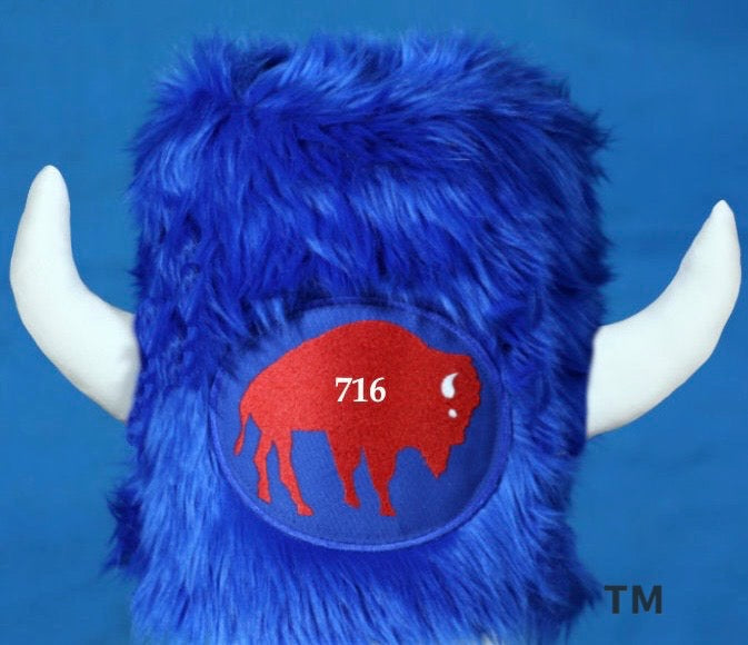 Our 716 Water Buffalo Club logo patch is sewn on the front of the hat. On the back of the hat is a tag that reads 'Water Buffalo Club, made in Buffalo, NY.' They are made from luxury shag fur, one of the most popular furs commonly used in mascot suit-making. It is known for its shiny softness. The inside has sturdy foam to hold them up and is then lined with a cotton jersey knit material, and is very soft on the skin. If they get wet, only hang them to dry; do not put them in the dryer as it could ruin them.