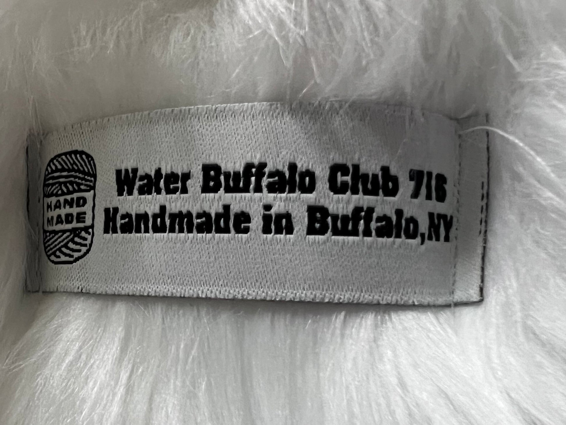 Our Original Water Buffalo Club logo patch is sewn on the front of the hat. On the back of the hat is a tag that reads 'Water Buffalo Club, made in Buffalo, NY.' They are made from luxury shag fur, one of the most popular furs commonly used in mascot suit-making. It is known for its shiny softness. The inside has sturdy foam to hold them up and is then lined with a cotton jersey knit material, and is very soft on the skin. If they get wet, only hang them to dry; do not put them in the dryer as it could ruin them.